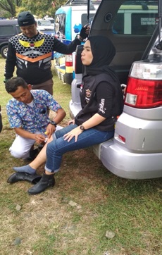 sedang mengobati luka ringan salah satu peserta konvoi yang terjatuh.